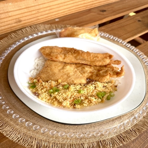Arroz Branco Soltinho, Bisteca Suína, e Batata Frita .